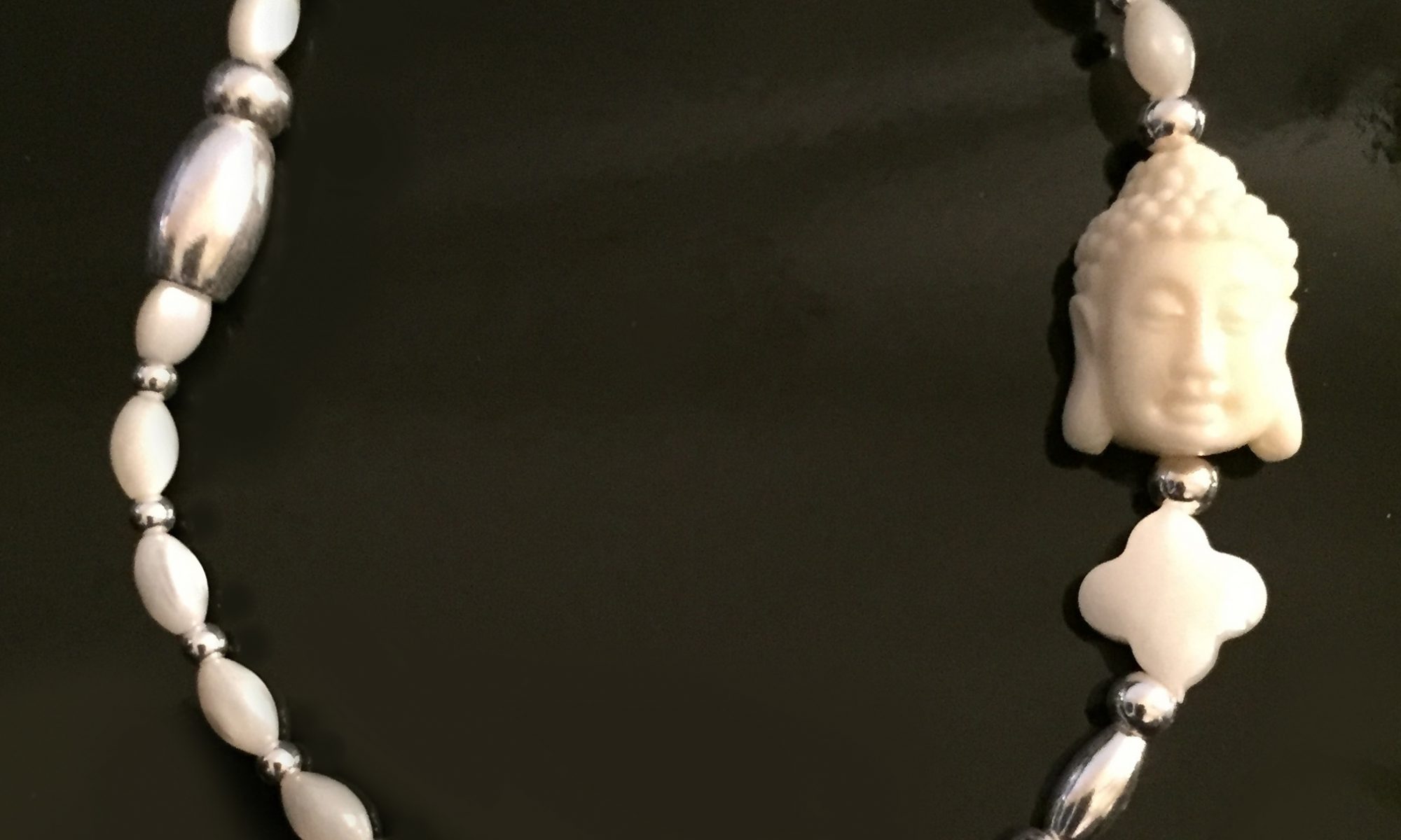 Mittelpunkt ist ein weisser Buddhakopf und ein Perlmuttkleeblatt.