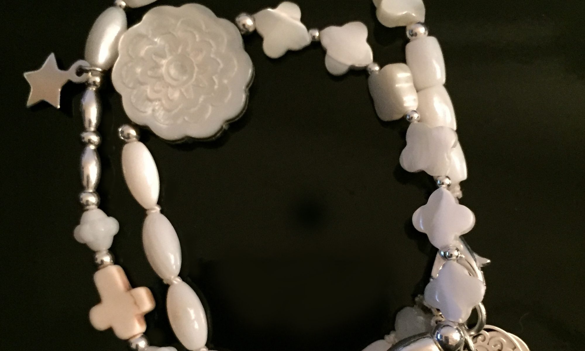 Zweireihiges Armband aus verschiedenen Perlmutt- und Kristallperlen und einem Howlithkreuz.