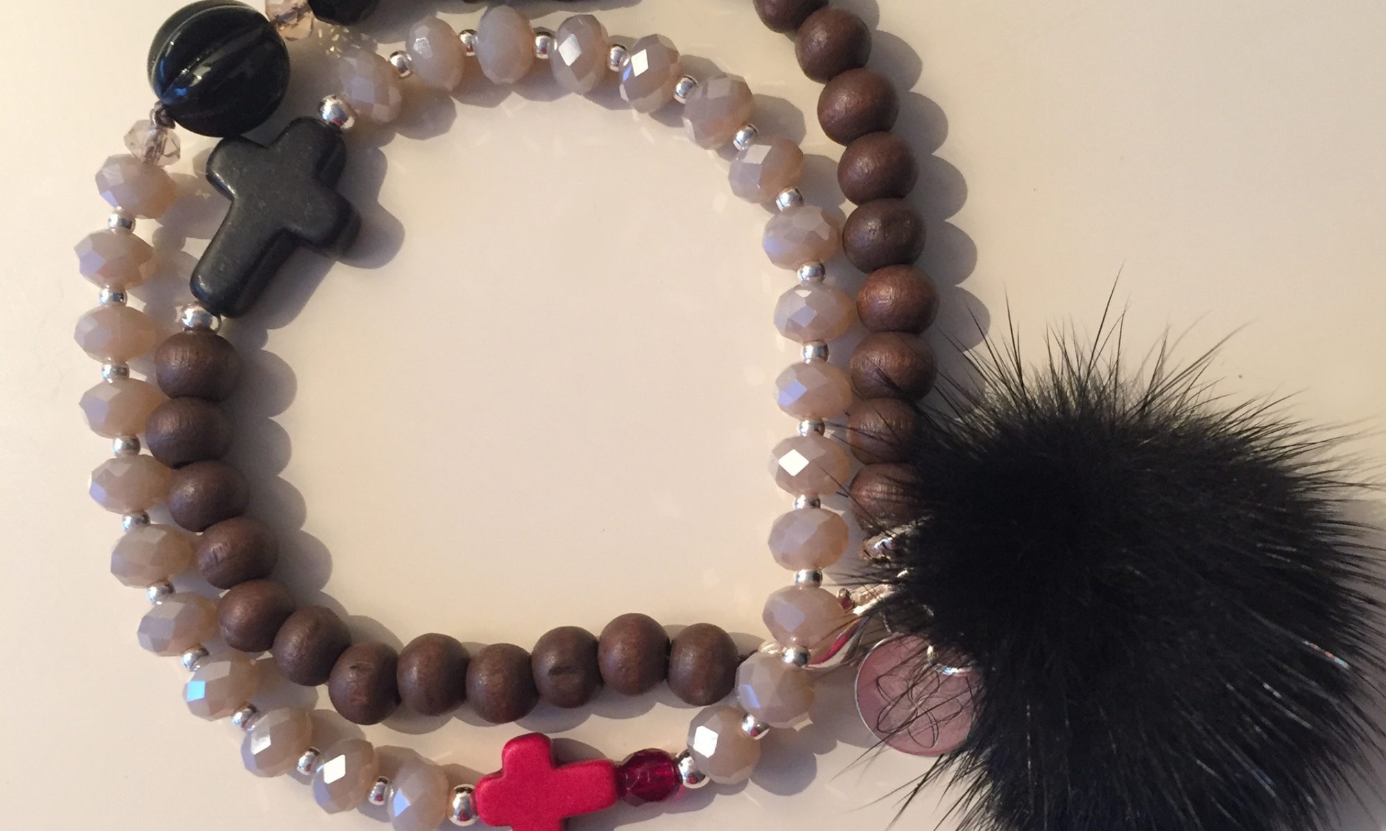 Zweireihiges Armband aus verschiedenen böhmischen  Kristall- und Glasperlen, Sterlingsilberperlen, Howlithkreuzen und einem schwarzen Buddhakopf.
