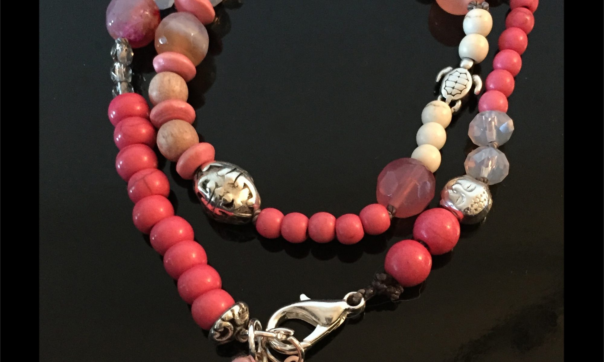 Zweireihiges Armband aus verschiedenen böhmischen Kristall- und Glasperlen, Holzperlen, Natursteinperlen, Halbedelsteinen, versilberten Elementen und Howlithperlen. Verschlossen wird es mit einem Karabiner. aus Sterlingsilber.